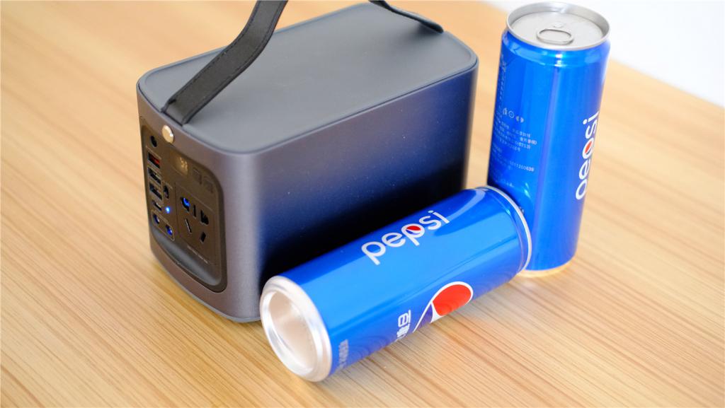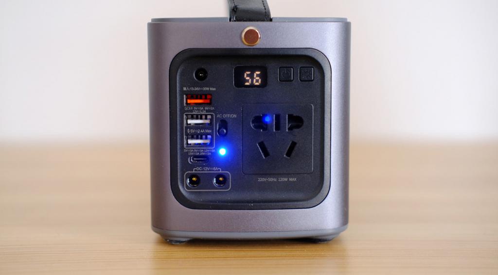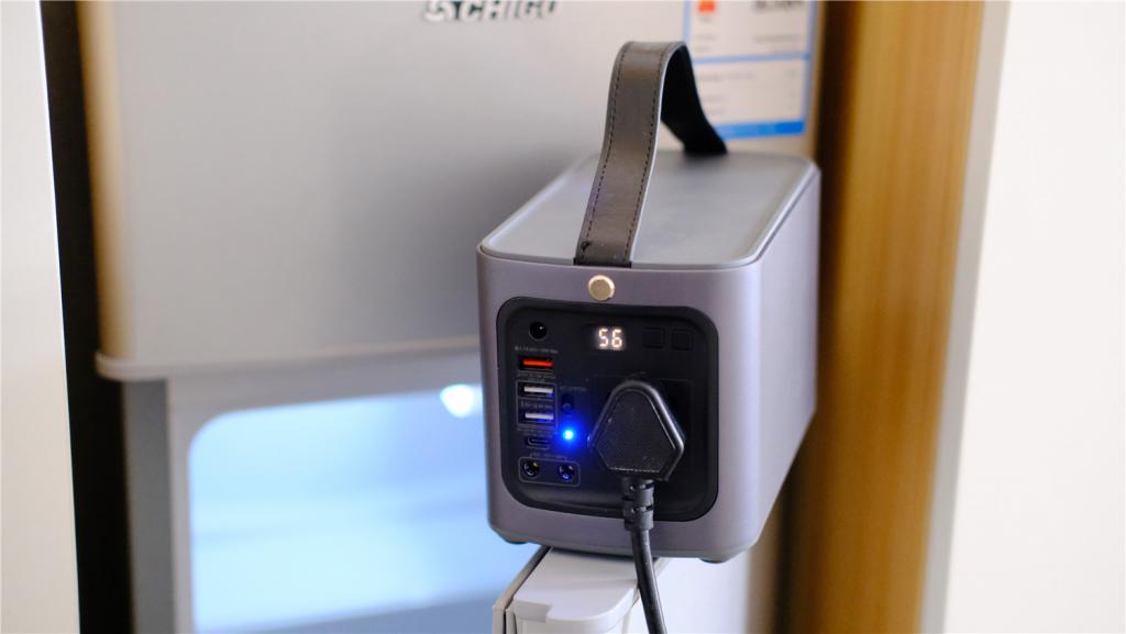 此外,要使用 220V/120W 五孔插座,还需要拨动 AC 电源开关,蓝色指示灯亮起表示已开启 220V 电源,不使用的时候往上拨动关闭,安全方便。突然停电的时候,可以用它作为应急电源,这台小冰箱的功率是 53W,所以运行起来基本没啥问题,可以支撑 1.5 小时,如果是车载冰箱,只要功率低于 120W 都可以用它驱动使用。