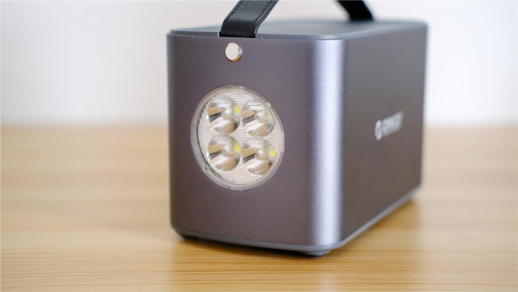 另一侧是是 4 枚 1W LED 灯面板,有个单独开关,按下即可打开,在夜间照明使用的时候,它的亮度还是非常高的,在停电的时候用它照明足够了,当然在户外遇到紧急情况也可以长按开启 SOS 灯光报警。