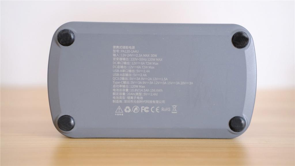 底部就是产品的一些参数信息,上面有提到过。总的来说这款 ORICO 户外电源在设计上我觉得是没啥可以挑剔的。此外产品在底部的四个边角还设有圆形硅胶防滑垫,可以安稳放置任何平面上。