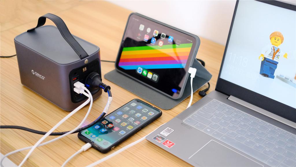在户外的时候,可以将电源放在桌上为自己的笔记本电脑、手机、iPad 充电。